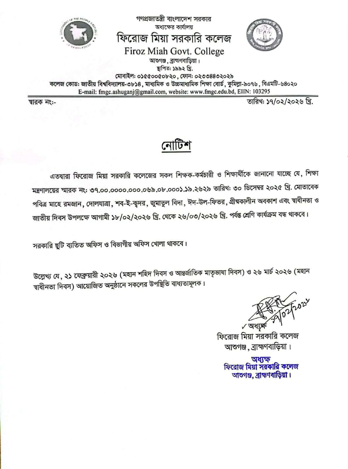 পবিত্র রমজান, দোলযাত্রা, শব-ই-ক্বদর, জুমাতুল বিদা, ঈদ-উল-ফিতর ও গ্রীষ্মকালীন অবকাশ উপলক্ষে কলেজের সকল শ্রেণি কার্যক্রম স্থগিত থাকা সংক্রান্ত নোটিশ।